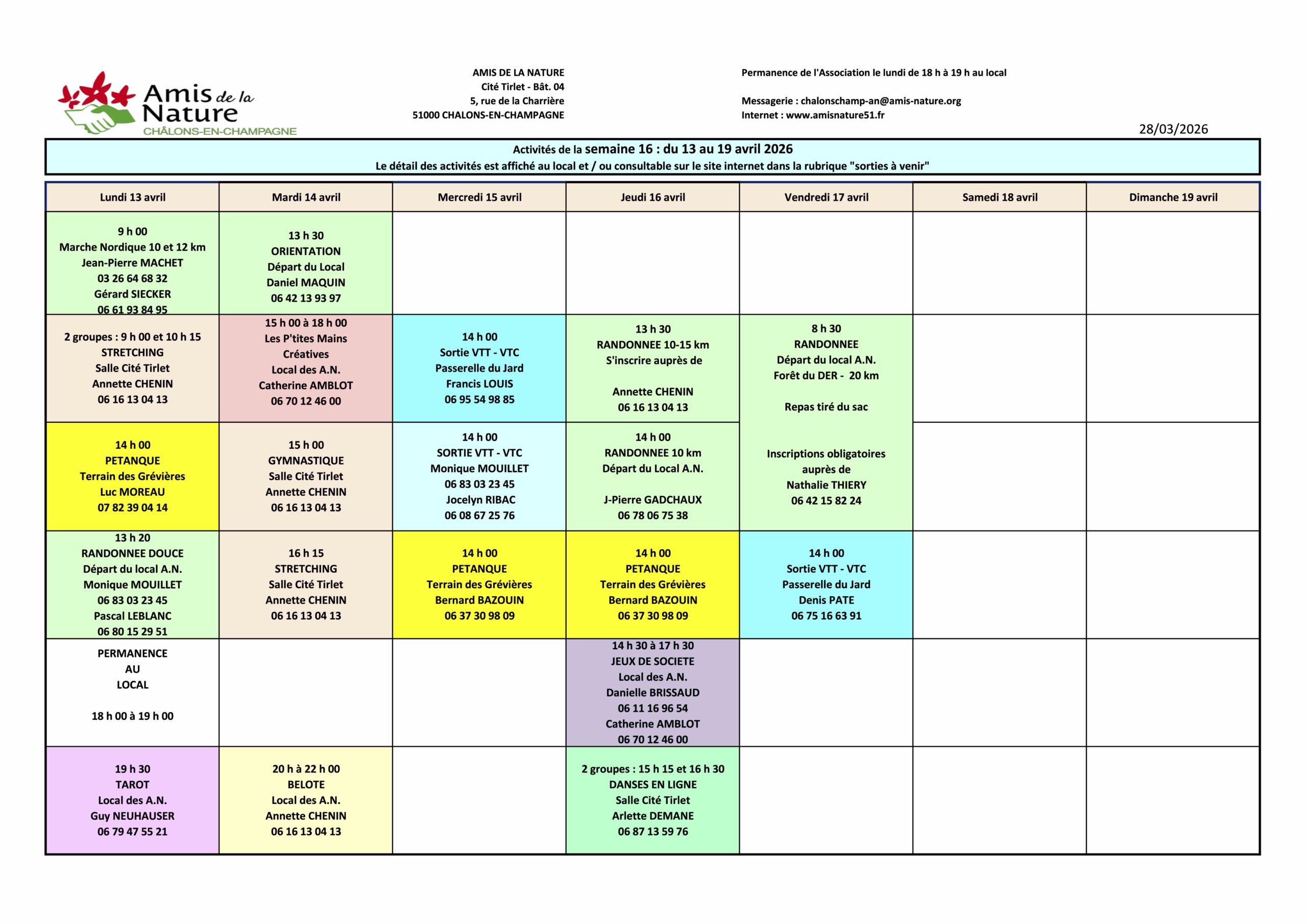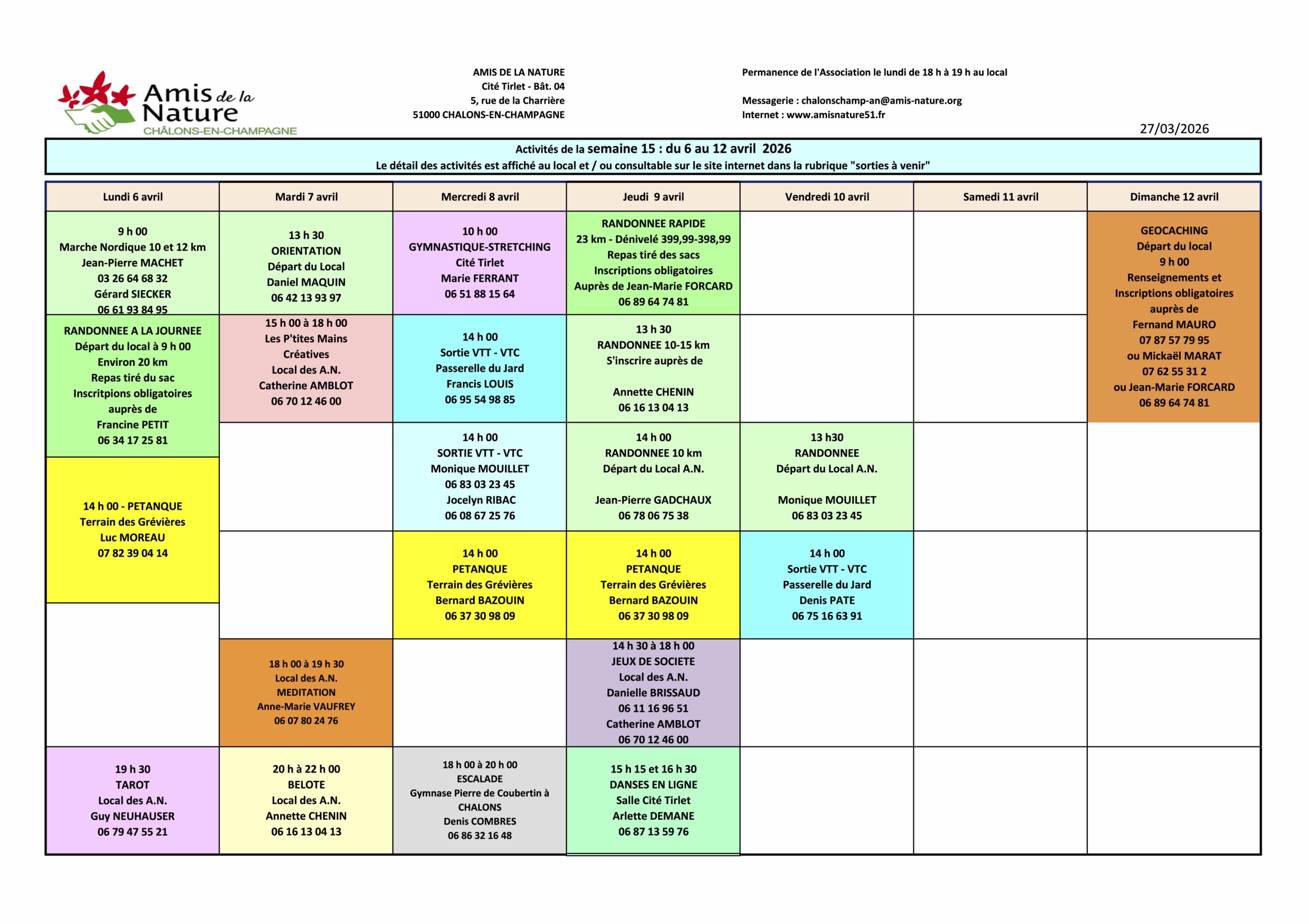 Les fiches ci-dessous peuvent être modifiées pour diverses raisons (annulation, report, changement d'horaires, etc..).