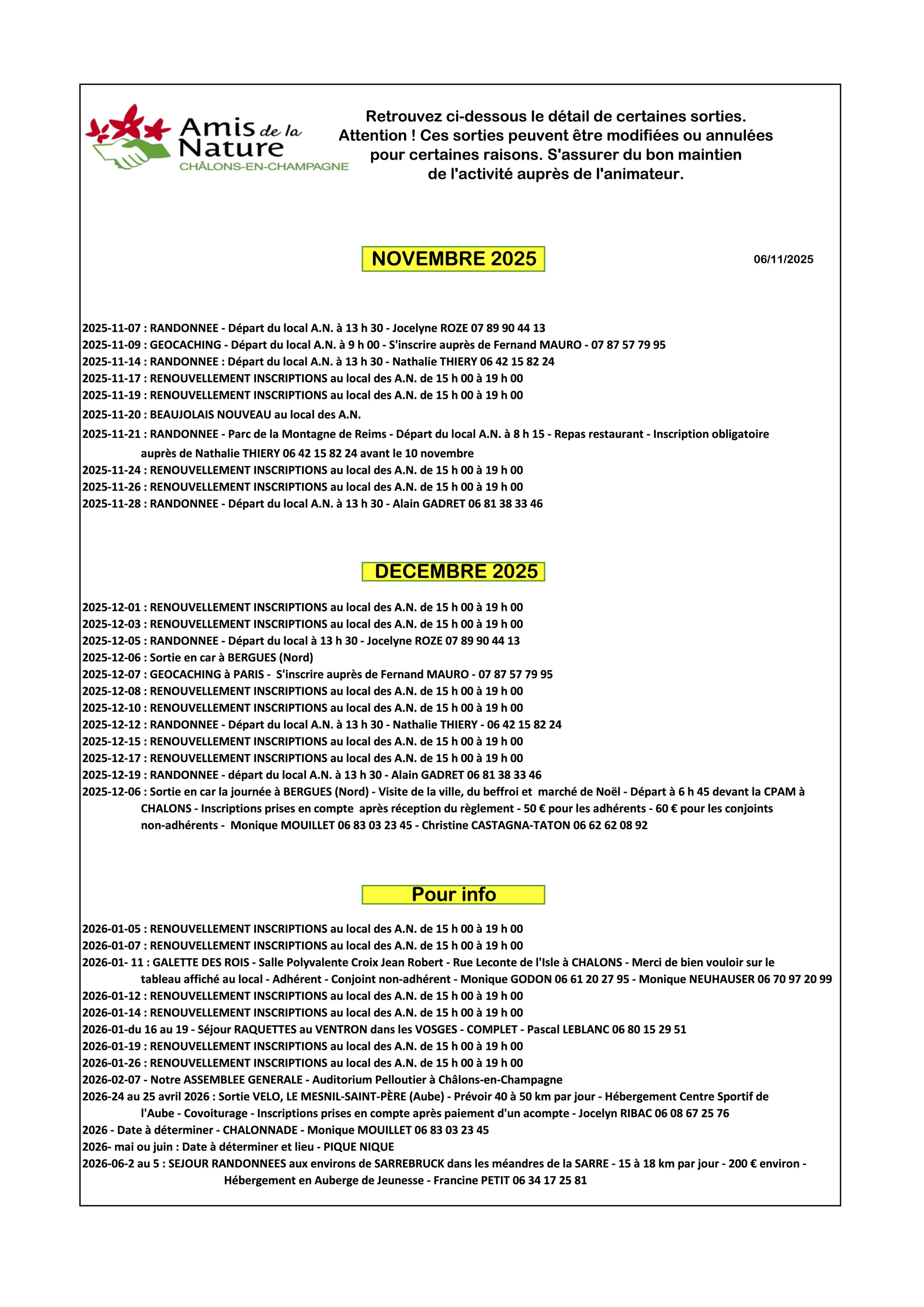 2025-11-20 : Soirée Beaujolais Nouveau2025-12-06 : Sortie à Bergues (Nord)2026-01-16 au 19 : Sortie raquettes à Ventron2026-01-30 : Soirée photos - Voyage en Albanie2026-06-02 au 05 : Séjour randonnée aux environs de Sarrebruck