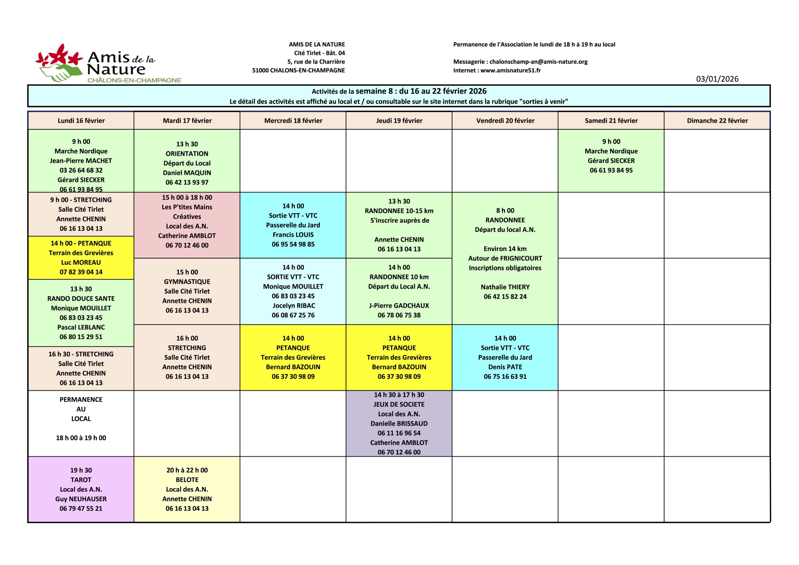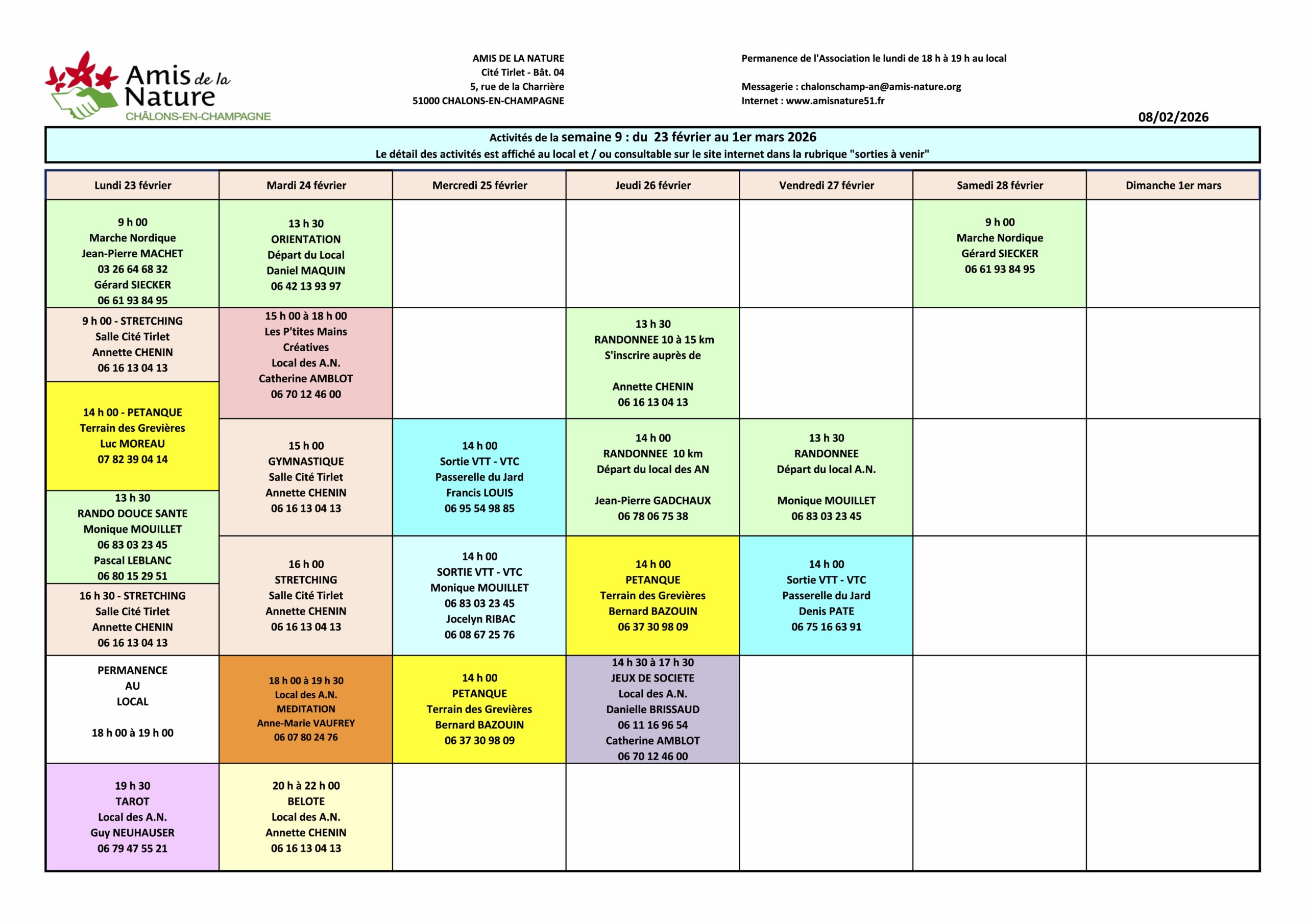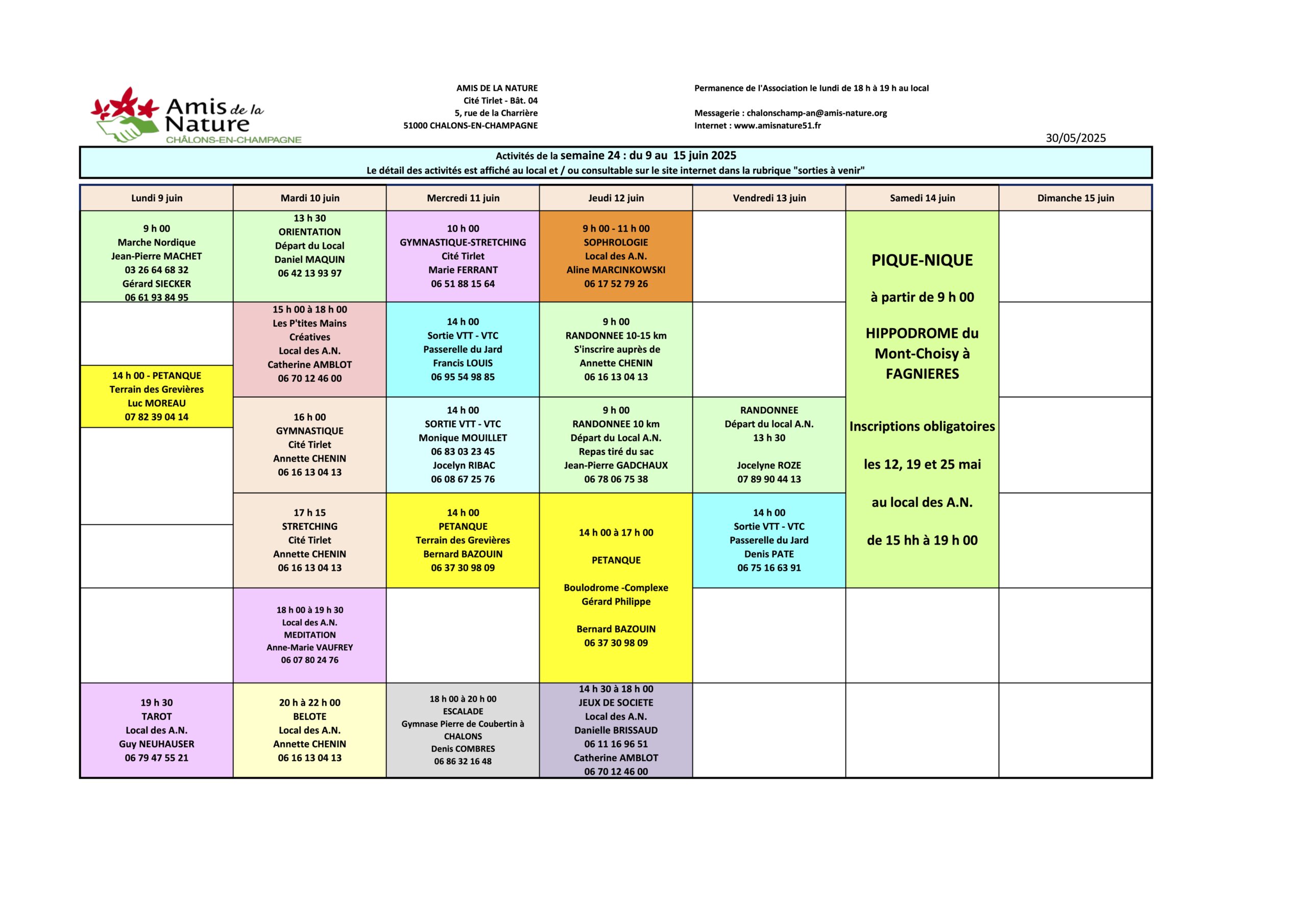 Les fiches ci-dessous peuvent être modifiées pour diverses raisons (annulation, report, changement d'horaires, etc..).