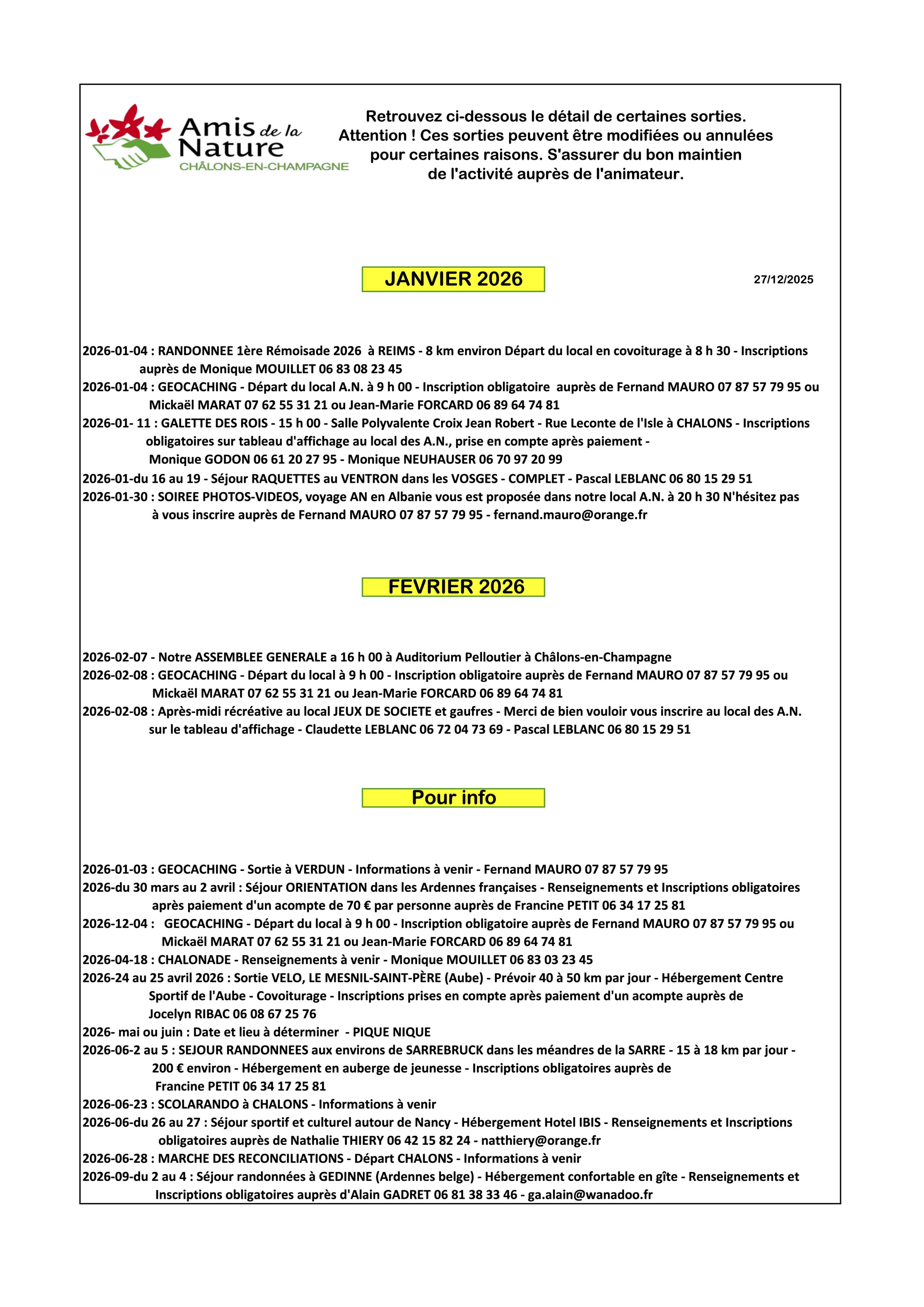 2026-06-02 au 05 : Séjour randonnée aux environs de Sarrebruck2026-06-26 et 27 : Séjour sportif et culturel autour de Nancy2026-09-02 au 04 : Séjour en Ardennes BelgesEn faveur de la lutte contre la mucoviscidose :